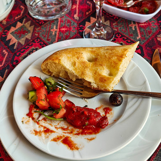 A következő megállónk egy helyi étterem volt, ahol ebédeltünk egy jót. Nagyon finom volt minden, ráadásul az összes kaja azeri eredetű volt. Az előétel egy paradicsom és uborka saláta volt friss tandir kenyérrel. Utána ettünk egy azeri lencse levest szintén kenyérrel, majd egy "grill-tálat" ettünk főételként, amin voltak sült zöldségek és csirke. Ki nem fogjátok találni, de ezt is kenyérrel ettük. Az azeri konyhában hatalmas szerepe van a kenyérnek, ráadásul iszonyatosan jó kenyereket sütnek mindenhol, szóval kalóriákra fel kell készülni. :D