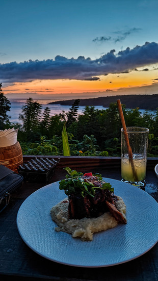 Innen elindultam vissza a szállásra pihenni és a medencében hűssölni, mielőtt visszamennék a Kelingking Beach-hez naplementét nézni, illetve ebédeltem is egyet a NANA Bistro-ban (nagyon jó hely!). Egy kicsivel naplemente előtt elindultam hát vissza a "dínó partra". Páran még voltak ott, de össze sem lehetett hasonlítani a napközbeni tömeggel. A naplementét itt kötelező megnézni, eszméletlen! Így, hogy nem volt tömeg, előjöttek még a majmok is. A napot pedig a Father Field Bistro-ban zártam egy fantasztikus vacsorával. Ez egy családi étterem és nagyon jól főznek.